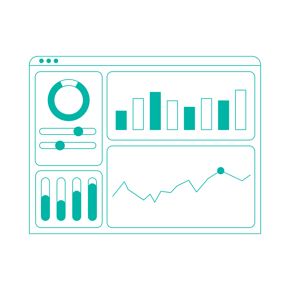 A digital dashboard with charts and graphs, including a pie chart, bar graphs, sectional sliders, and a line graph on a black background.