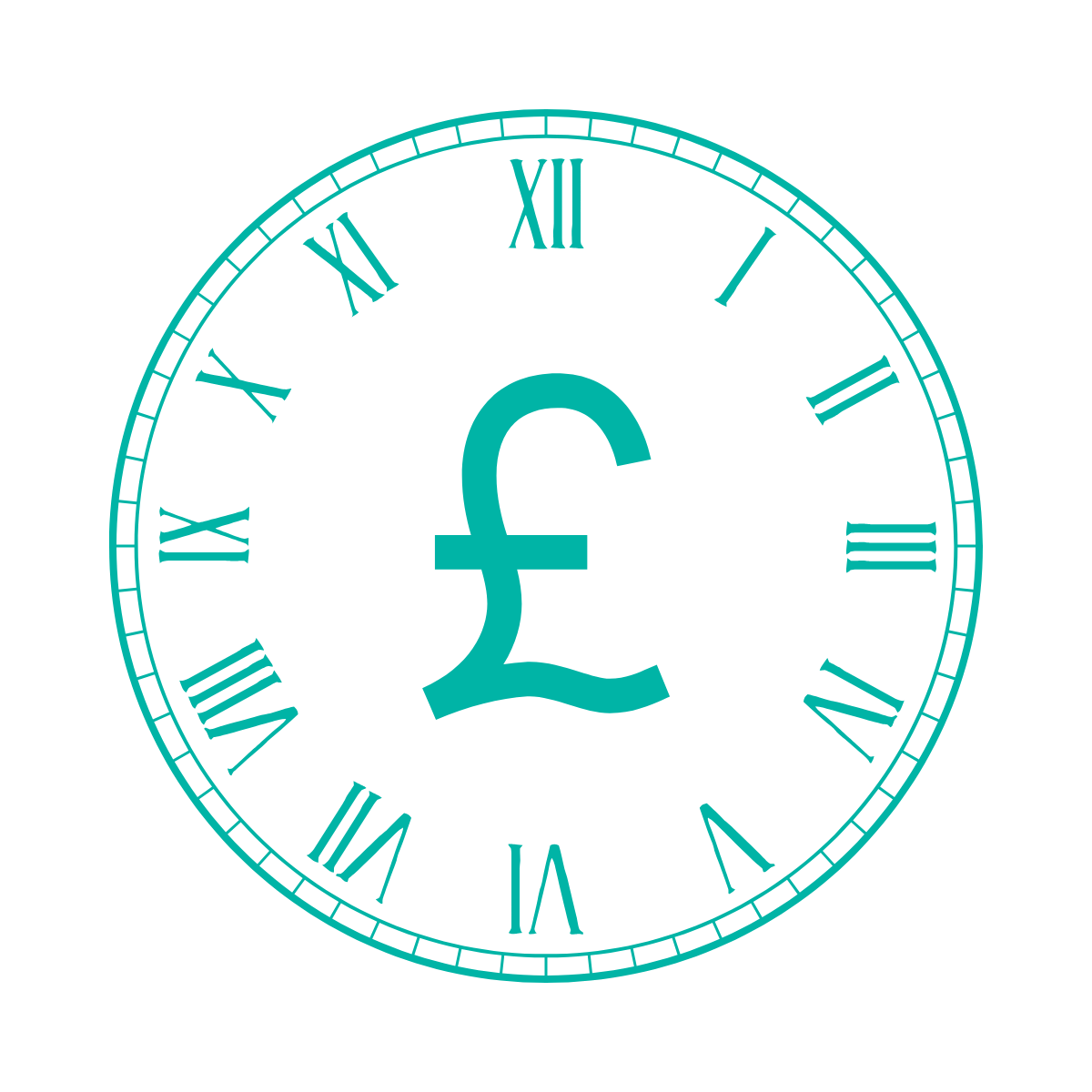 A clock face with Roman numerals, a large cyan British pound sign (£) in the center, and cyan markings and numbers on a black background.